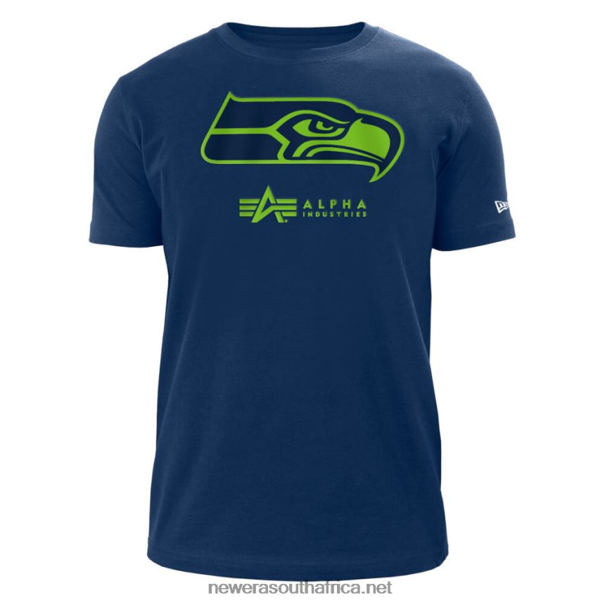 Official New Era Seattle Seahawks NFL Alpha Industries Navy T-ShirtTeam logo and Alpha Industries logo on frontNew Era logo and text on rearCrew neck cutShort sleeve designEmbroidered New Era flag to the leftModel wears a size Medium100% Cotton knit